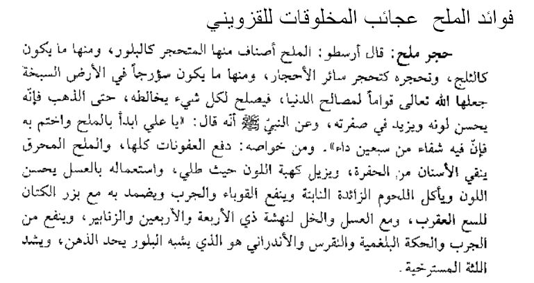 – وفي حديث آخر أن النبي محمد قال لعلي بن أبي طالب ( ياعلي ابدأ بالملح واختم به فان فيه شفاء من سبعين داء – حديث ضعيف أيضا